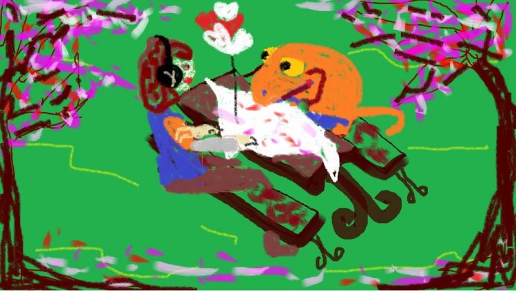 “I tried to draw a picture of my wizard Amber Roseflower sitting with my Mander friend at my Friendship Table using my Paint Program. We are enjoying the beautiful day under the Cherry Blossom Trees. Also, I am wearing my cool Wizard101 Headphones and Jersey. My favorite outfit! Mander wishes he had my outfit!!”