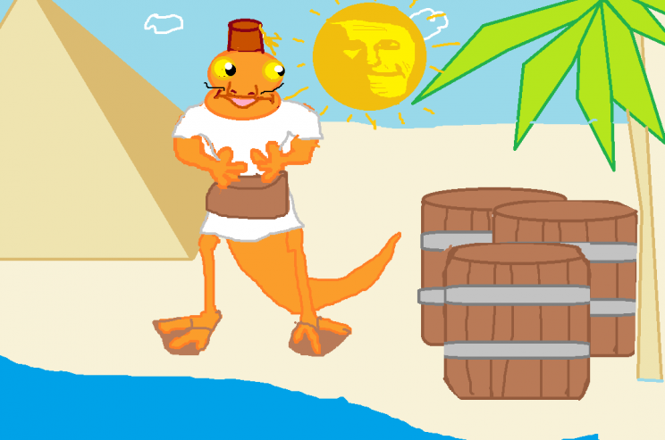“I wanted to capture the beautiful Krokotopia desert. Nothing is more wonderful than bathing in the hot, hot, hot, hot, hot sun. Not to mention, my new slippers protect my delicate toes from the sand griddle. Can you guess what I have stored in these barrels? Hint: It’s the best kind of treat to have in the summer.”