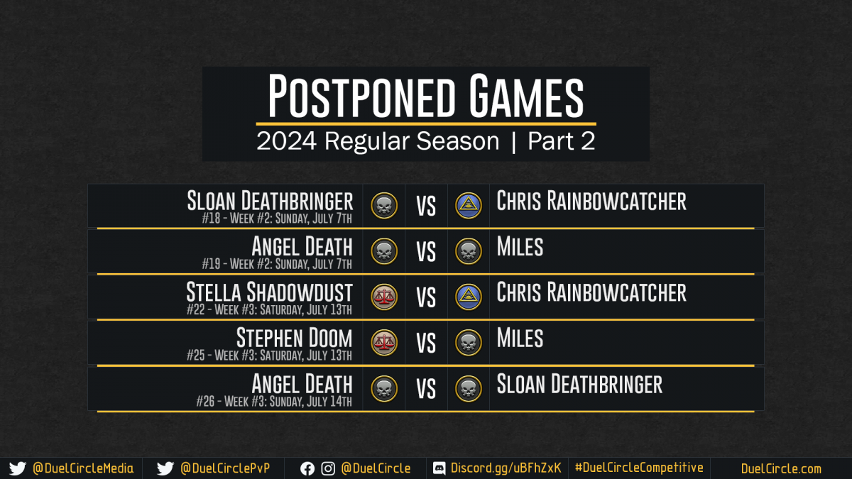 DuelCircle Competitive – 2024 Postponed Games Part 2 July 15th Update Image published on: July 17, 2024 Image size: 1920 × 1080 px Image file name: DuelCircle-Competitive-2024-Postponed-Games-Part-2-July-15th-Update.png
