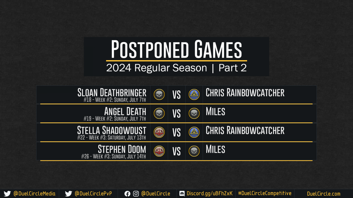 DuelCircle Competitive – 2024 Postponed Games Part 2 July 19th Update Image published on: July 19, 2024 Image size: 1920 × 1080 px Image file name: DuelCircle-Competitive-2024-Postponed-Games-Part-2-July-19th-Update.png