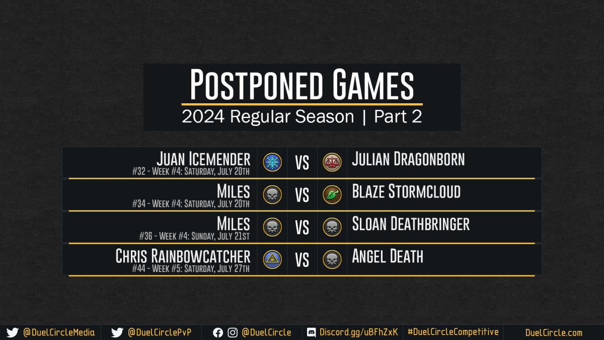 DuelCircle Competitive – 2024 Postponed Games Part 2 July 25th 5pmEDT Update Image published on: July 25, 2024 Image size: 1920 × 1080 px Image file name: DuelCircle-Competitive-2024-Postponed-Games-Part-2-July-25th-5pmEDT-Update.png