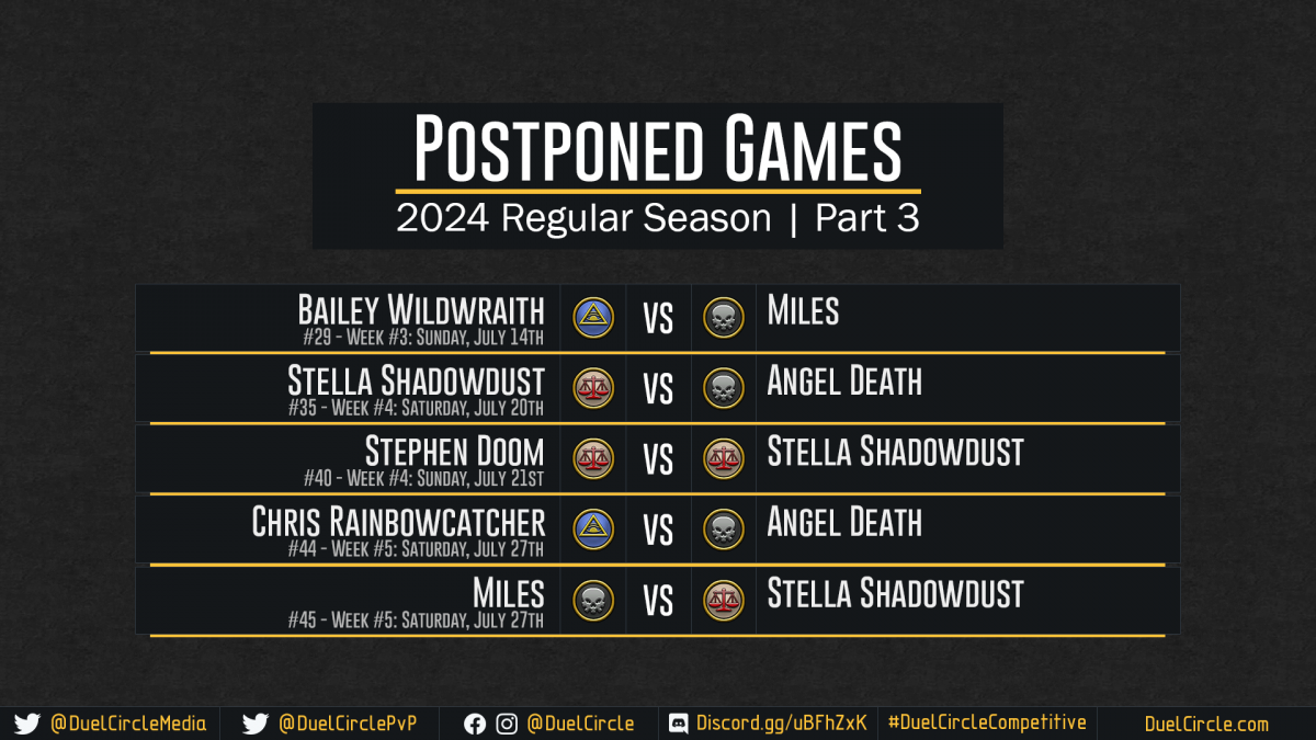 DuelCircle Competitive – 2024 Postponed Games Part 3 July 15th Update Image published on: July 17, 2024 Image size: 1920 × 1080 px Image file name: DuelCircle-Competitive-2024-Postponed-Games-Part-3-July-15th-Update.png