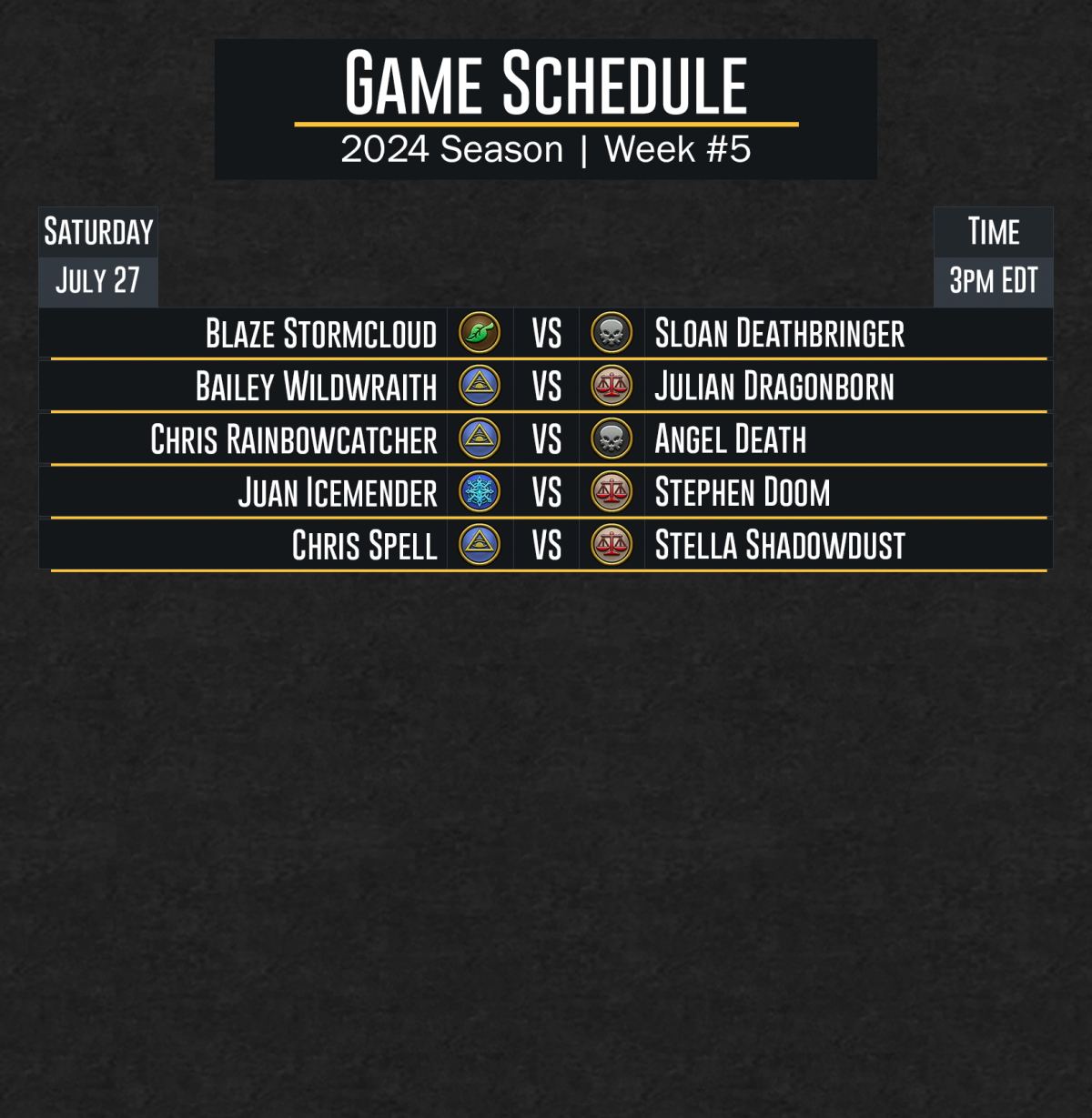 DuelCircle Competitive 2024 Week 5 Regular Season Schedule – July 6th Update Image published on: July 8, 2024 Image size: 1628 × 1667 px Image file name: DuelCircle-Competitive-2024-Week-5-Regular-Season-Schedule-July-6th-Update.png
