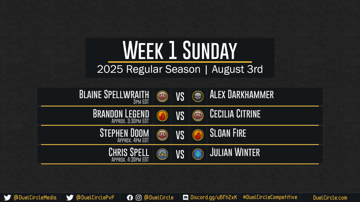 DuelCircle Competitive – 2025 Season Week 1 Sunday’s Scheduled Games Image published on: August 11, 2025 Image size: 1920 × 1080 px Image file name: DuelCircle-Competitive-2025-Season-Week-1-Sundays-Scheduled-Games.png