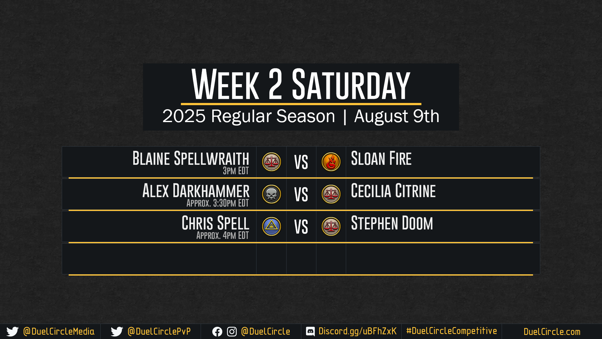 DuelCircle Competitive – 2025 Season Week 2 Saturday’s Scheduled Games Image published on: August 11, 2025 Image size: 1920 × 1080 px Image file name: DuelCircle-Competitive-2025-Season-Week-2-Saturdays-Scheduled-Games.png